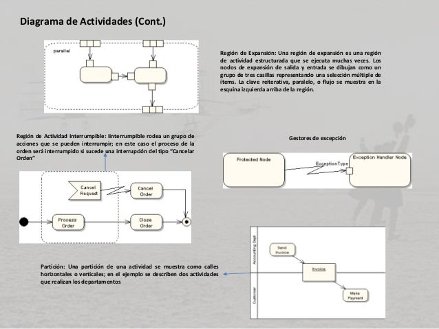 - 9. Diagrama de Actividades (Cont.) Región de Expansión: Una región de expansión es una región de actividad estructurada que se ejecuta muchas veces. Los nodos de expansión de salida y entrada se dibujan como un grupo de tres casillas representando una selección múltiple de ítems. La clave reiterativa, paralelo, o flujo se muestra en la esquina izquierda arriba de la región. Gestores de excepciónRegión de Actividad Interrumpible: Iinterrumpible rodea un grupo de acciones que se pueden interrumpir; en este caso el proceso de la orden será interrumpido si sucede una interrupción del tipo “Cancelar Orden” Partición: Una partición de una actividad se muestra como calles horizontales o verticales; en el ejemplo se describen dos actividades que realizan los departamentos