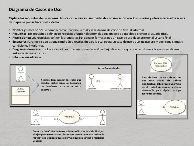 - 10. Diagrama de Casos de Uso Captura los requisitos de un sistema. Los casos de uso son un medio de comunicación con los usuarios y otros interesados acerca de lo que se piensa hacer del sistema. • Nombre y Descripción: Se nombra como una frase verbal y se le da una descripción textual informal. • Requisitos: Los requisitos definen los requisitos funcionales formales que un caso de uso debe proveer al usuario final. • Restricciones: Los requisitos definen los requisitos funcionales formales que un caso de uso debe proveer al usuario final. • Escenarios: Una restricción es una condición o restricción bajo la cual opera un caso de uso y que incluye pre, y post condiciones y condiciones invariantes. • Diagramas de escenarios: Un escenario es una descripción formal del flujo de eventos que ocurren durante la ejecución de una instancia de casos de uso. • Información adicional Actores: Representan los roles que pueden incluir usuarios humanos, un hardware externo u otros sistemas. Actor Generalizado Caso de Uso: Un caso de uso es una sola unidad de trabajo significativo. Este provee una vista de alto nivel de comportamiento observable para alguien o algo fuera del sistema. Conector “use”: Puede tener valores múltiples en cada final, en el ejemplo se muestra un cliente que puede tener usa sesión de “retiro” a la vez pero que el servicio puede atender a múltiples usuarios