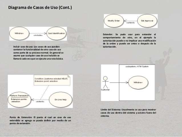 - 11. Diagrama de Casos de Uso (Cont.) Incluir caso de uso: Los casos de uso pueden contener la funcionalidad de otro caso de uso como parte de su proceso normal. En general se asume que cualquier caso de uso incluido se llamará cada vez que se ejecute una ruta básica. Extender: Se pude usar para extender el comportamiento de otro, en el ejemplo la autorización puede o no implicar una modificación de la orden y puede ser antes o después de la autorización. Punto de Extensión: El punto al cual un caso de uso extendido se agrega se puede definir por medio de un punto de extensión. Límite del Sistema: Usualmente se usa para mostrar casos de uso dentro del sistema y actores fuera del sistema.