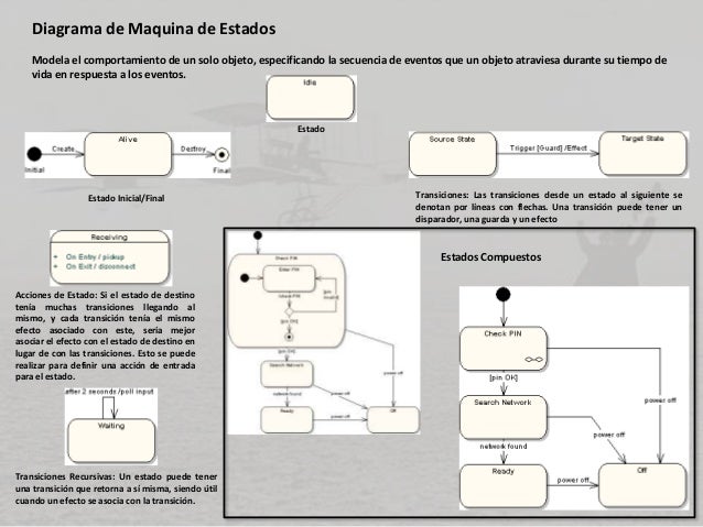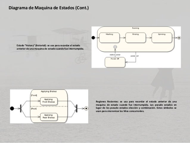 - 14. Diagrama de Maquina de Estados (Cont.) Estado “history” (historial): se usa para recordar el estado anterior de una maquina de estado cuando fue interrumpida. Regiones Recientes: se usa para recordar el estado anterior de una maquina de estado cuando fue interrumpida. Los pseudo estados en lugar de los pseudo estados elección y combinación. Estos símbolos se usan para sincronizar los hilos concurrentes.