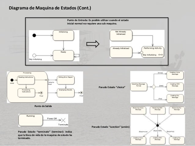 - 13. Diagrama de Maquina de Estados (Cont.) Punto de Entrada: Es posible utilizar cuando el estado inicial normal no requiere una sub maquina. Punto de Salida Pseudo Estado “choice” Pseudo Estado “Junction” (unión) Pseudo Estado “terminate” (terminar): Indica que la línea de vida de la maquina de estado ha terminado.