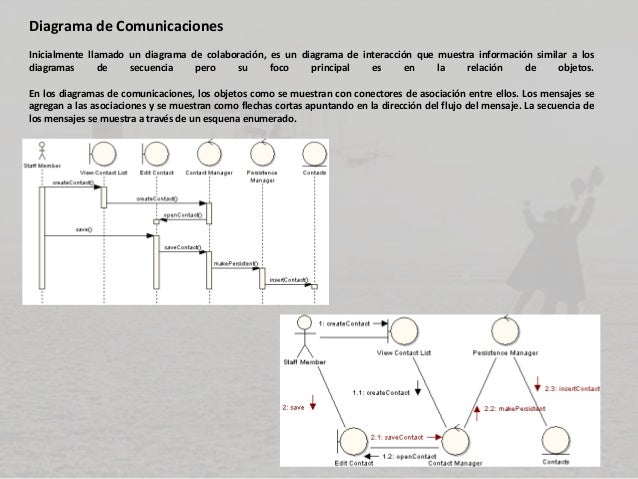 - 17. Diagrama de Comunicaciones Inicialmente llamado un diagrama de colaboración, es un diagrama de interacción que muestra información similar a los diagramas de secuencia pero su foco principal es en la relación de objetos. En los diagramas de comunicaciones, los objetos como se muestran con conectores de asociación entre ellos. Los mensajes se agregan a las asociaciones y se muestran como flechas cortas apuntando en la dirección del flujo del mensaje. La secuencia de los mensajes se muestra a través de un esquena enumerado.