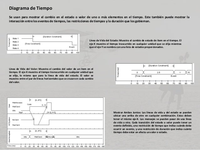 - 18. Diagrama de Tiempo Se usan para mostrar el cambio en el estado o valor de uno o más elementos en el tiempo. Este también puede mostrar la interacción entre los eventos de tiempos, las restricciones de tiempos y la duración que los gobiernan. Línea de Vida del Estado: Muestra el cambio de estado de ítem en el tiempo. El eje-X muestra el tiempo trascurrido en cualquier unidad que se elija mientras que el eje-Y se nombra con una lista de estados proporcionados. Línea de Vida del Valor: Muestra el cambio del valor de un ítem en el tiempo. El eje-X muestra el tiempo transcurrido en cualquier unidad que se elija, lo mismo que para la línea de vida del estado. El valor se muestra entre el par de líneas horizontales que se cruzan en cada cambio del valor. Mostrar Ambos Juntos: Las líneas de vida y del estado se pueden ubicar una arriba de otro en cualquier combinación. Estas deben tener el mismo eje-X. Los mensajes se pueden pasar de una línea de vida a otra. Cada transición del estado o valor puede tener un evento definido, una restricción de tiempo que indica cuándo debe ocurrir un evento, y una restricción de duración que indica cuánto tiempo debe estar en efecto un valor o estado.