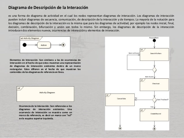 - 19. Diagrama de Descripción de la Interacción es una forma de diagrama de actividad en el cual los nodos representan diagramas de interacción. Los diagramas de interacción pueden incluir diagramas de secuencia, comunicación, de descripción de la interacción y de tiempos. La mayoría de la notación para los diagramas de descripción de la interacción es la misma que para los diagramas de actividad, por ejemplo los nodos inicial, final, decisión, combinación, bifurcación y unión son todos lo mismo. Sin embargo, los diagramas de descripción de la interacción introducen dos elementos nuevos, ocurrencias de interacción y elementos de interacción. Ocurrencia de la Interacción: Son referencias a los diagramas de interacción existentes. Una ocurrencia de interacción se muestra como un marco de referencia, es decir un marco con “ref” en la esquina superior izquierda. Elementos de Interacción: Son similares a los de ocurrencias de interacción en el hecho de que estos muestran una representación de diagramas de interacción existentes dentro de un marco rectangular