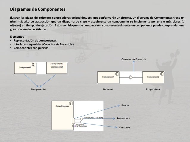 - 3 Diagramas de Componentes Ilustran las piezas del software, controladores embebidos, etc. que conformarán un sistema. Un diagrama de Componentes tiene un nivel más alto de abstracción que un diagrama de clase – usualmente un componente se implementa por una o más clases (u objetos) en tiempo de ejecución. Estos son bloques de construcción, como eventualmente un componente puede comprender una gran porción de un sistema. Elementos • Representación de componentes • Interfaces requeridas (Conector de Ensamble) • Componentes con puertos Componentes Conector de Ensamble ProporcionaConsume Puerto Proporciona Consume