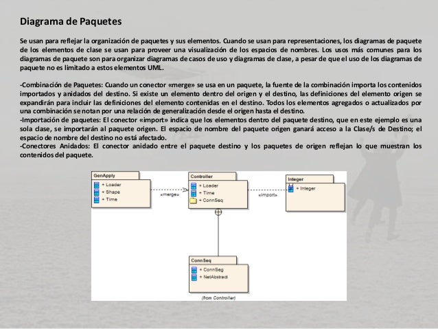 - 6. Diagrama de Paquetes Se usan para reflejar la organización de paquetes y sus elementos. Cuando se usan para representaciones, los diagramas de paquete de los elementos de clase se usan para proveer una visualización de los espacios de nombres. Los usos más comunes para los diagramas de paquete son para organizar diagramas de casos de uso y diagramas de clase, a pesar de que el uso de los diagramas de paquete no es limitado a estos elementos UML. -Combinación de Paquetes: Cuando un conector «merge» se usa en un paquete, la fuente de la combinación importa los contenidos importados y anidados del destino. Si existe un elemento dentro del origen y el destino, las definiciones del elemento origen se expandirán para incluir las definiciones del elemento contenidas en el destino. Todos los elementos agregados o actualizados por una combinación se notan por una relación de generalización desde el origen hasta el destino. -Importación de paquetes: El conector «import» indica que los elementos dentro del paquete destino, que en este ejemplo es una sola clase, se importarán al paquete origen. El espacio de nombre del paquete origen ganará acceso a la Clase/s de Destino; el espacio de nombre del destino no está afectado. -Conectores Anidados: El conector anidado entre el paquete destino y los paquetes de origen reflejan lo que muestran los contenidos del paquete.