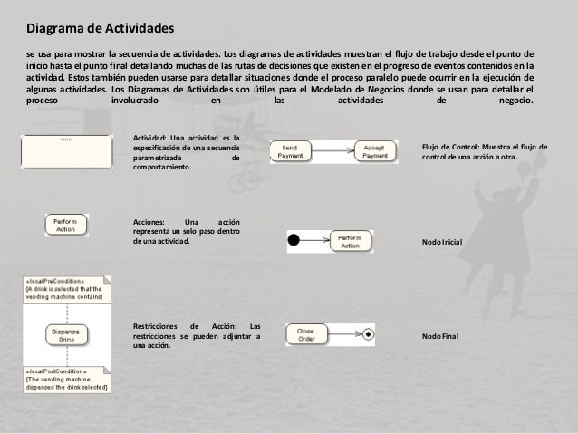 - 7. Diagrama de Actividades se usa para mostrar la secuencia de actividades. Los diagramas de actividades muestran el flujo de trabajo desde el punto de inicio hasta el punto final detallando muchas de las rutas de decisiones que existen en el progreso de eventos contenidos en la actividad. Estos también pueden usarse para detallar situaciones donde el proceso paralelo puede ocurrir en la ejecución de algunas actividades. Los Diagramas de Actividades son útiles para el Modelado de Negocios donde se usan para detallar el proceso involucrado en las actividades de negocio. Actividad: Una actividad es la especificación de una secuencia parametrizada de comportamiento. Acciones: Una acción representa un solo paso dentro de una actividad. Restricciones de Acción: Las restricciones se pueden adjuntar a una acción. Flujo de Control: Muestra el flujo de control de una acción a otra. Nodo Inicial Nodo Final